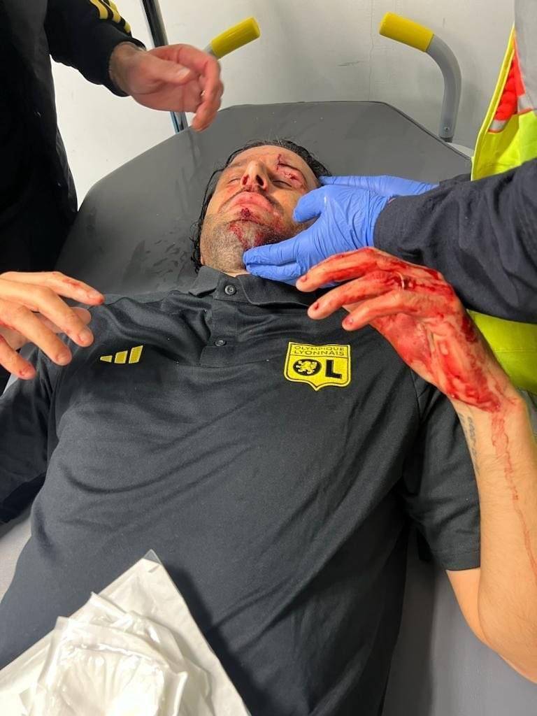 在这次袭击中,不仅大巴车受损严重,里昂主帅格罗索的眼睛也被啤酒罐击中,脸部流血。最终他被送往医院缝了12针,比赛也被推迟。